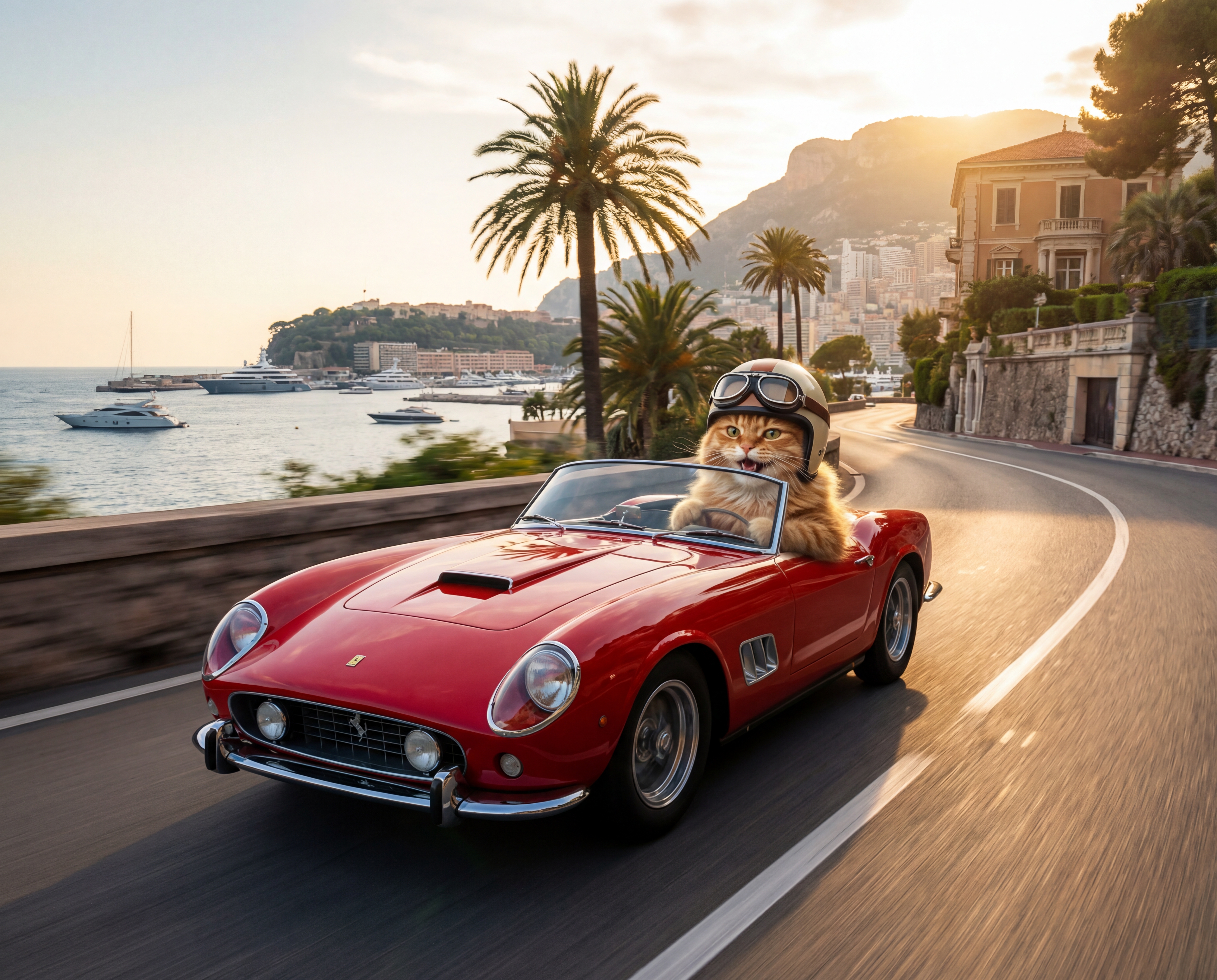 Image photoréaliste de haute qualité d'un chat roux conduisant une voiture de course décapotable rouge sur la Côte d'Azur.